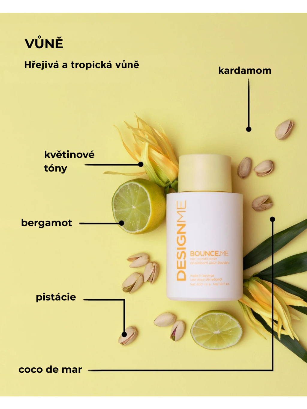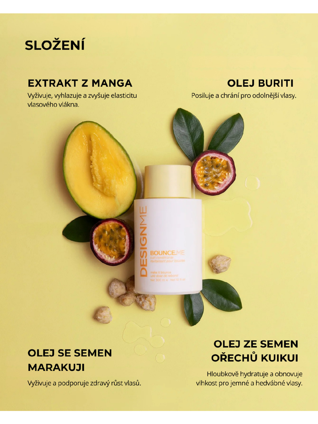 BOUNCE.ME curl conditioner má bohaté, krémové složení, které vlasy hydratuje a dodává jim pružnost a lesk. Vyživuje, zbavuje krepu a revitalizuje suché, těžko zkrotitelné texturované vlasy a zároveň nabízí antistatické výhody. Zanechává vlasy vyživené, lesklé a plné života, zatímco podporuje a zvýrazňuje přirozenou texturu a tvar kudrlin. Tento kondicionér je obohacen o hydrolyzovaný protein z Quinoa, olej Buriti, Moringový olej, výtažky z plodů manga, Kukui olej a výtažky z plodů mučenky.