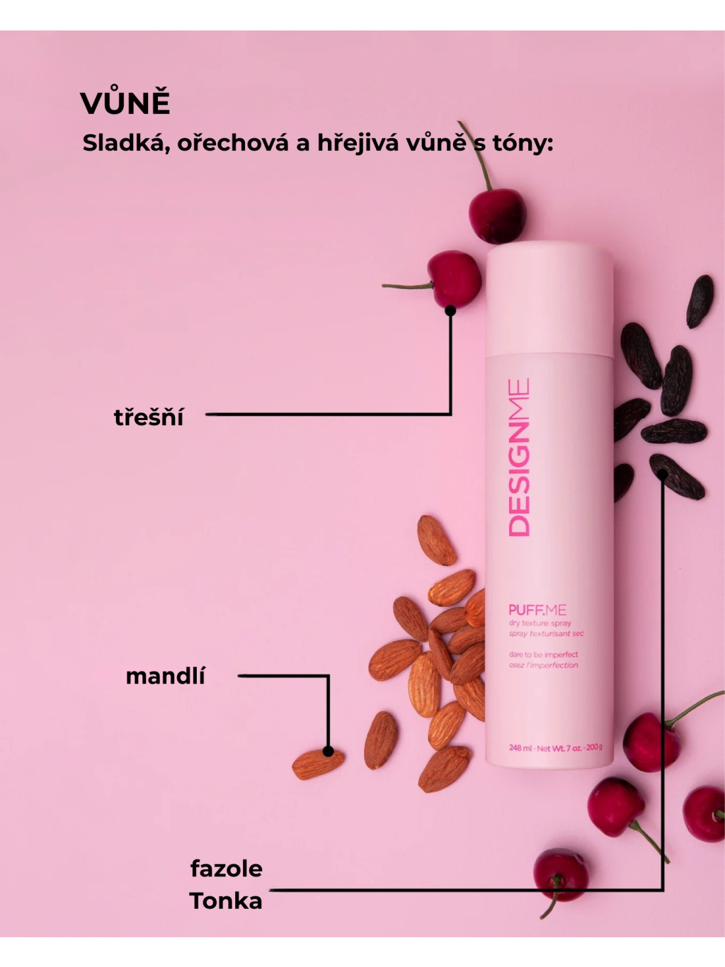 Dokončovací stylingový produkt PUFF.ME dry texture spray vytváří okamžitý objem a plnost s lehkou, vzdušnou texturou. Nabízí flexibilní držení, které pomáhá prodloužit životnost vašeho stylu a snadno dosáhnout žádaného efektu bez zatížení vlasů.